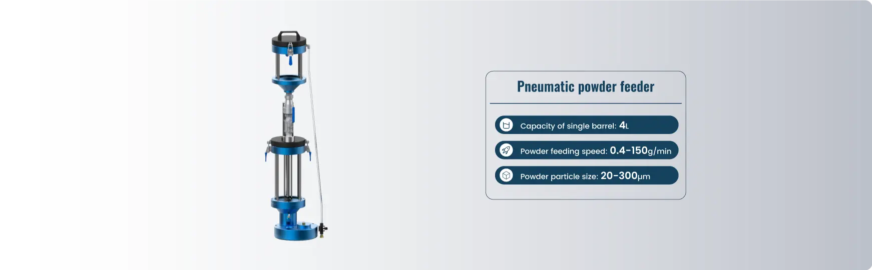Este alimentador de disco, accionado por servomotor, funciona de manera estable con alta precisión. El barril transparente permite observar fácilmente el nivel residual de polvo. La función de agitación del polvo facilita la mezcla y evita obstrucciones. La detección de nivel bajo de polvo activa una alarma en caso de escasez.