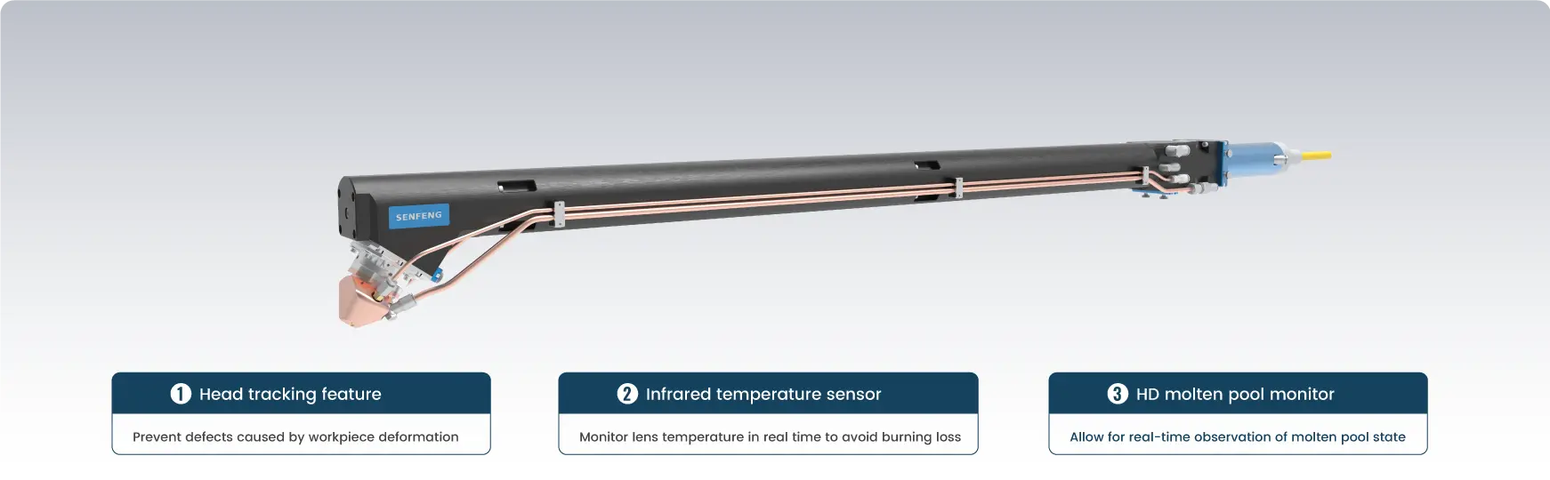 Con función de seguimiento, sensor de temperatura infrarrojo y sistema de monitoreo en alta definición, evita defectos de recubrimiento causados por deformación de la pieza. Se aplica principalmente a orificios internos, círculos exteriores, orificios pasantes y ciegos.